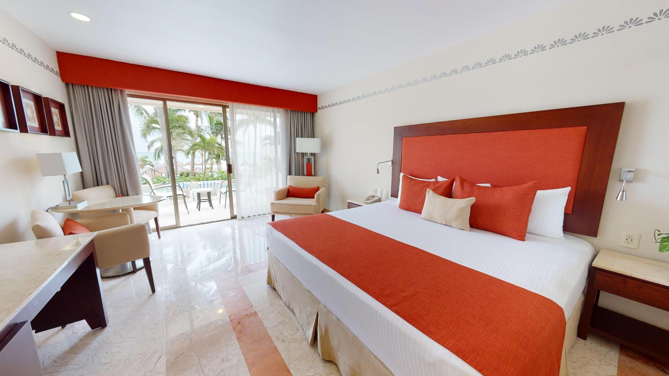 The Deluxe Swim Up Ocean View Rooms at Grand Park Royal Cancún features a private terrace with direct access to a pool, situated on the ground floor of the main building. Exclusively for adults, this room includes a king-size bed, comfortably accommodating up to two guests. Indulge in the luxury of a rain shower and organic bath amenities in the well-appointed bathroom, and take advantage of 24-hour room service. This elegant space is the ideal sanctuary for soaking in the stunning beauty of the Mexican Caribbean.