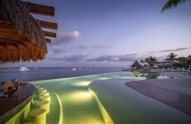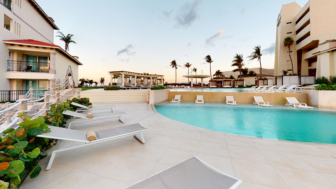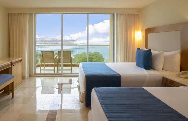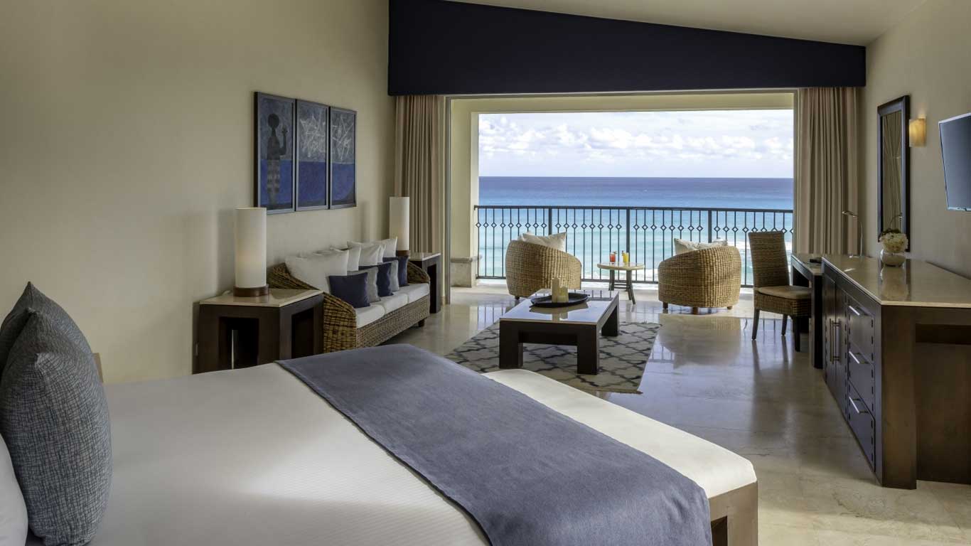 The Royal Tower Beachfront rooms at Grand Park Royal Cancún, exclusively for adult guests, combines luxury and ultra comfort in elegantly decorated and fully stocked guest rooms. Available with two double beds (shown) or one king, every balcony provides a spectacular view of the Caribbean sea. A jetted tub opposite the head of the room provides the perfect compliment to a full size bath, and an automated room divider combines privacy and spacious luxury. With a 32-inch flat-screen cable TV and DVD player, voice mail telephone, clock radio with iPod dock, minibar, and a writing desk, it's perfect for working vacation or even an extended stay. The marble bathroom with rainfall shower, double vanity, and lots of extras make private access to the Royal Tower Lounge just icing on the cake.